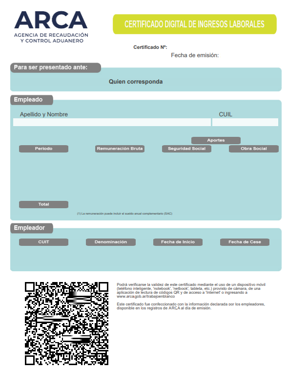 Muestra las remuneraciones de los últimos 6 meses de todos los empleadores con los que hayas trabajado. Podés acceder desde el servicio con clave fiscal, escaneando el código de respuesta rápida (QR) o desde la consulta pública de CDIL.